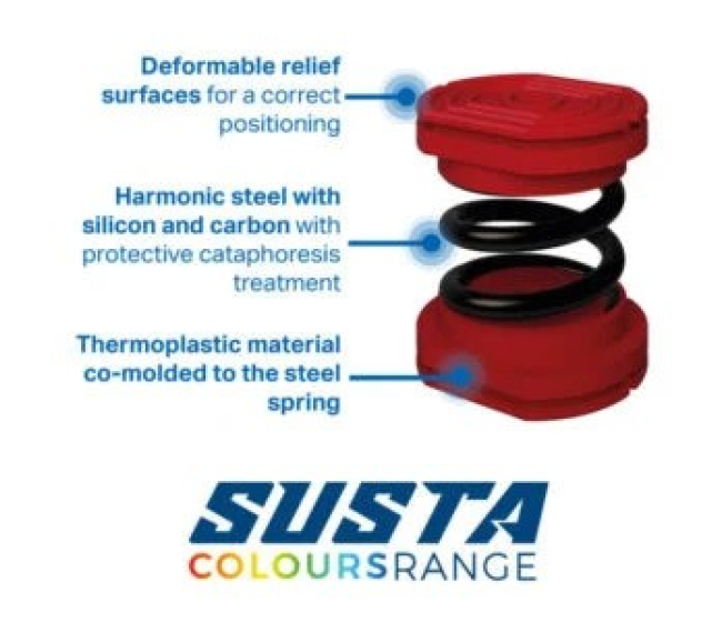 Tlmiče vibrácií Susta Colours majú centrálnu pružinu vyrobenú z ocele s kremíkom a uhlíkom s ochrannou ionizačnou úpravou.
