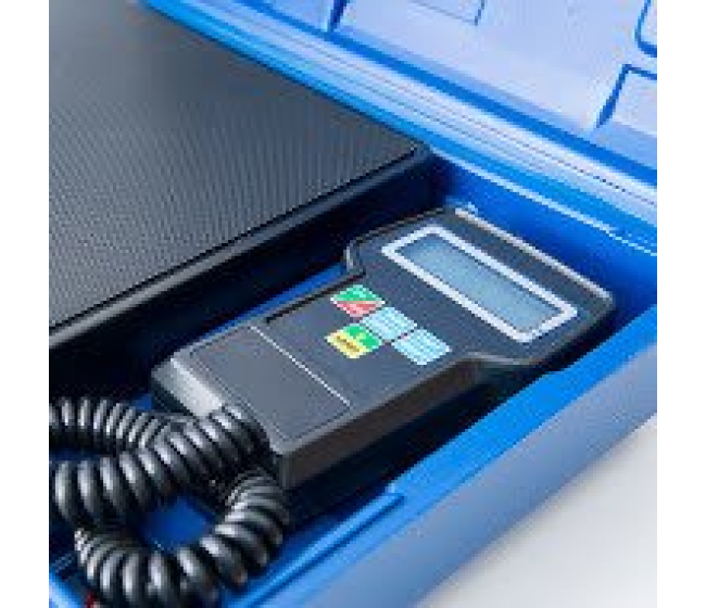 Váha chladiva RCS-7040 v robustnom plastovom puzdre. Aby sa zabránilo falšovaniu nameraných hodnôt, mala by sa táto váha počas váženia vybrať z puzdra.