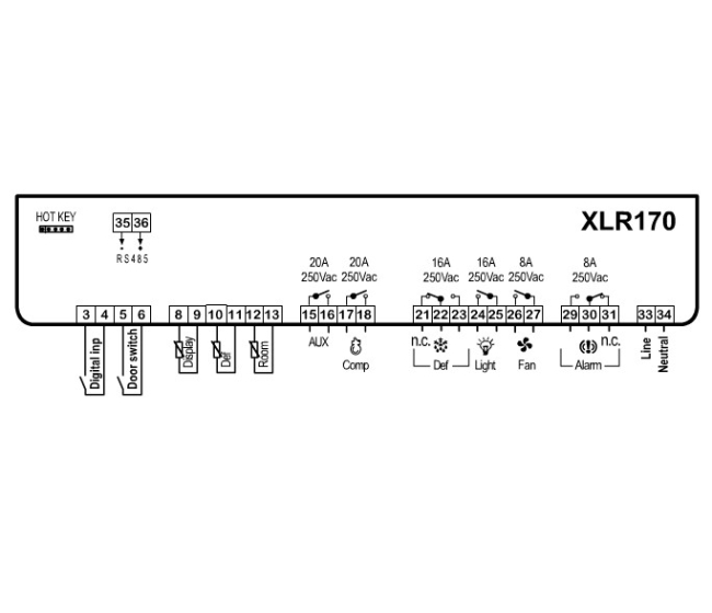 XLR170; kompaktní nástěnný regulátor DIXELL XLR170 5N1C3 s RS485, rozměr 210 x 235 mm, montáž na stěnu, napájení: 230 Vstř, 3x PTC/NTC, 6x výstupní relé, RS485, regulátor pro chlazení / topení, silné relé kompresoru 20A, odtávání možno volitelně řídit reálným časem, světlo ovládáné dveřním spínačem, velký display, ikony stavů, bzučák, alarmové výstupní relé, funkce HACCP (záznam min a max teploty), komunikace RS485 ModBus RTU