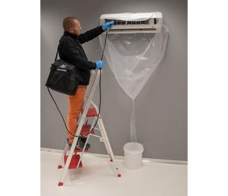 WALLY je priehľadný polyetylénový (PE) kryt, ktorý zaisťuje úplnú ochranu oblasti okolo štiepky počas čistiacich operácií. Čistenie bez rizika Vďaka WALLY, ktorá dokonale priľne k nástennej klimatizácii, môže technik úplne bezpečne vyčistiť výparník a jeho rebrové špirály, čím sa zredukujú demontážne operácie na minimum a štiepenie zostane na stene. Do 20-litrového vedra (súčasť balenia 15 ks) stečie čistiaca, oplachová voda a nečistoty bez rizika poškodenia okolitých povrchov.