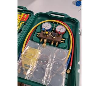 Sada obsahuje kufrík, 90 cm hadice a meniteľné sklíčka podľa typu chladiva: R12, R22, 134a, R404A, R407A, R407C, R502, R507