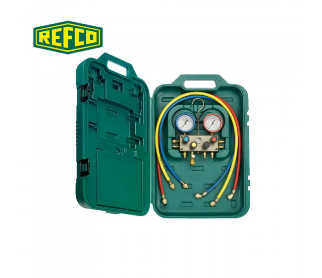4-cestný rozdeľovač s meradlami typu Bourdon a 3 nabíjacími hadicami 1/4" SAE farebne kódovaný, modrá, červená, žltá, dĺžka 90 cm (36"), v pevnom plastovom kufríku. So samostatným puzdrom vrátane 8 kusov "SNAP-ON" teplotných váh.