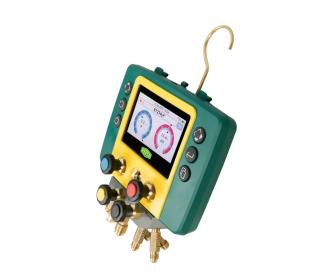 Digitálny 4-cestný manometer s 5 nabíjacími hadicami s guľovými ventilmi, 3/8" vákuovou hadicou, 2 teplotnými snímačmi typu K, 2 bezdrôtovými teplotnými svorkami a bezdrôtovým digitálnym vákuometrom.