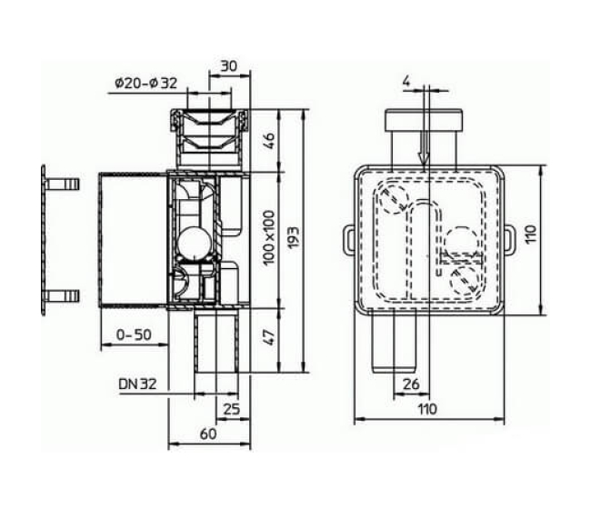 Neprepúšťa kanalizačné plyny (zápach) ani v suchom stave a je čistiteľný pomocou vyberateľnej kazety, na ktorú je možné napájať potrubia a hadice od d 20 - 32 mm.