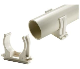 Príchytka /držiak, svorka/ PVC trubky 2001CF je určená pre PVC rúry s priemerom 20 mm. Je vyrobená z pevného, samozhášavého PVC materiálu. Balenie obsahuje 100 ks. Slúži na upevnenie potrubia na stenu.