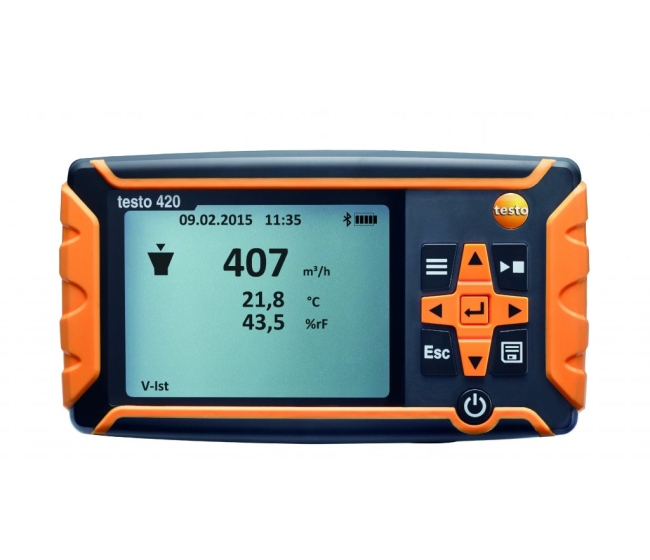 Prístroj na meranie objemového prietoku Testo 420 je ľahké, presné a komfortné riešenie pre regulovanie objemových prietokov na veľkoplošných vzduchotechnických výustkách (na strane vstupu aj výstupu). S hmotnosťou iba 2,9 kg je najľahším riešením na trhu. Vďaka svojmu integrovanému usmerňovaču prúdenia zaručuje presné výpočty objemového prietoku na vírivých anemostatoch.