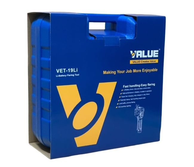 Pertlovačka rúr aku VALUE VET-19Li, prevádzka na batérie: 7,4V 2.0 Ah Li Batéria, vonkajší priemer rúrok: 1/4", 3/8", 1/2" 5/8" (16 mm), 3/4 "