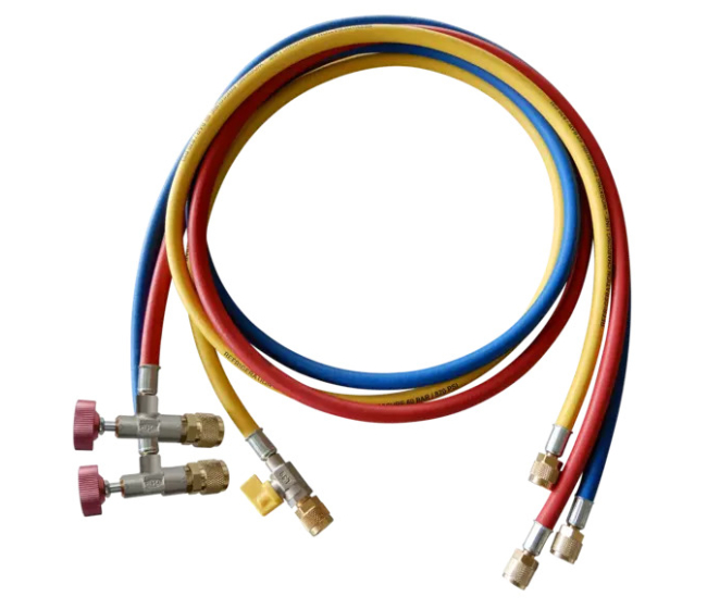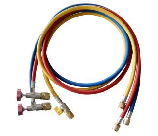 Modrá a červená hadica s ventilom na kontrolu prístupu 5/16" SAE (1/2"-20 UNF) pre jednoduché plnenie a odsávanie chladiaceho systému.