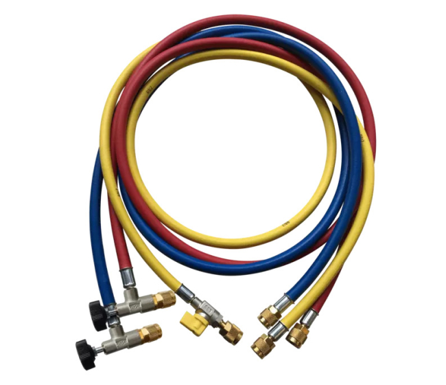 Modrá a červená hadica s ventilom 1/4" SAE pre jednoduché plnenie a odsávanie chladiaceho systému.