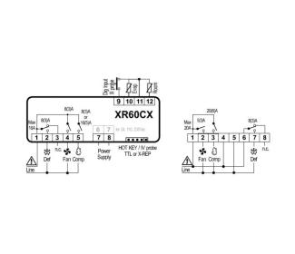 XR60CX 5N0C1; regulátor elektronický XR60CX 5N0C1 Dixell, s riadením ventilátora, rozmer 32 x 74 mm, napájanie 230Vstr, vstup 3x PTC/NTC (-50..150 °C), 3x relé (20A pre kompresor), montáž do panelu